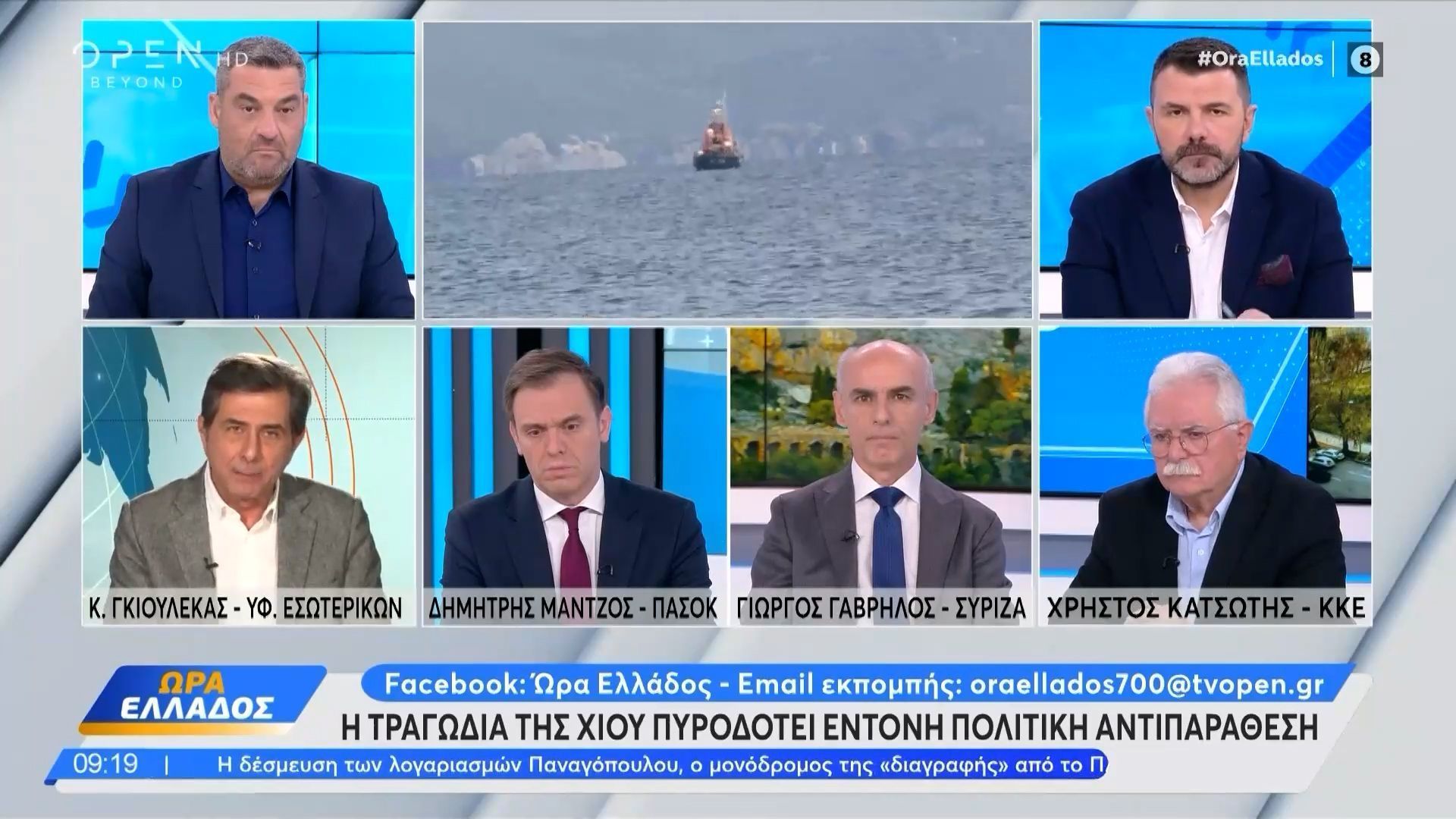 Στην εκπομπή «Ώρα Ελλάδος», οι πολιτικοί εκπρόσωποι Κωνσταντίνος Γκιουλέκας, Δημήτρης Μάντζος, Γιώργος Γαβρήλος και Χρήστος Κατσώτης αντάλλαξαν απόψεις σχετικά με την πρόσφατη τραγωδία που σημειώθηκε στη Χίο. Η συζήτηση εστίασε στις ευθύνες της κυβέρνησης και την ανάγκη για άμεσες δράσεις και μέτρα προκειμένου να αποφευχθούν παρόμοια περιστατικά στο μέλλον.