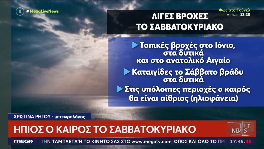 Η μετεωρολόγος Χριστίνα Ρήγου αναλύει την πρόγνωση του καιρού για το προσεχές Σαββατοκύριακο, το οποίο θα είναι ήπιο και ευχάριστο. Οι θερμοκρασίες θα κυμανθούν σε φυσιολογικά επίπεδα για την εποχή, προσφέροντας ιδανικές συνθήκες για υπαίθριες δραστηριότητες.