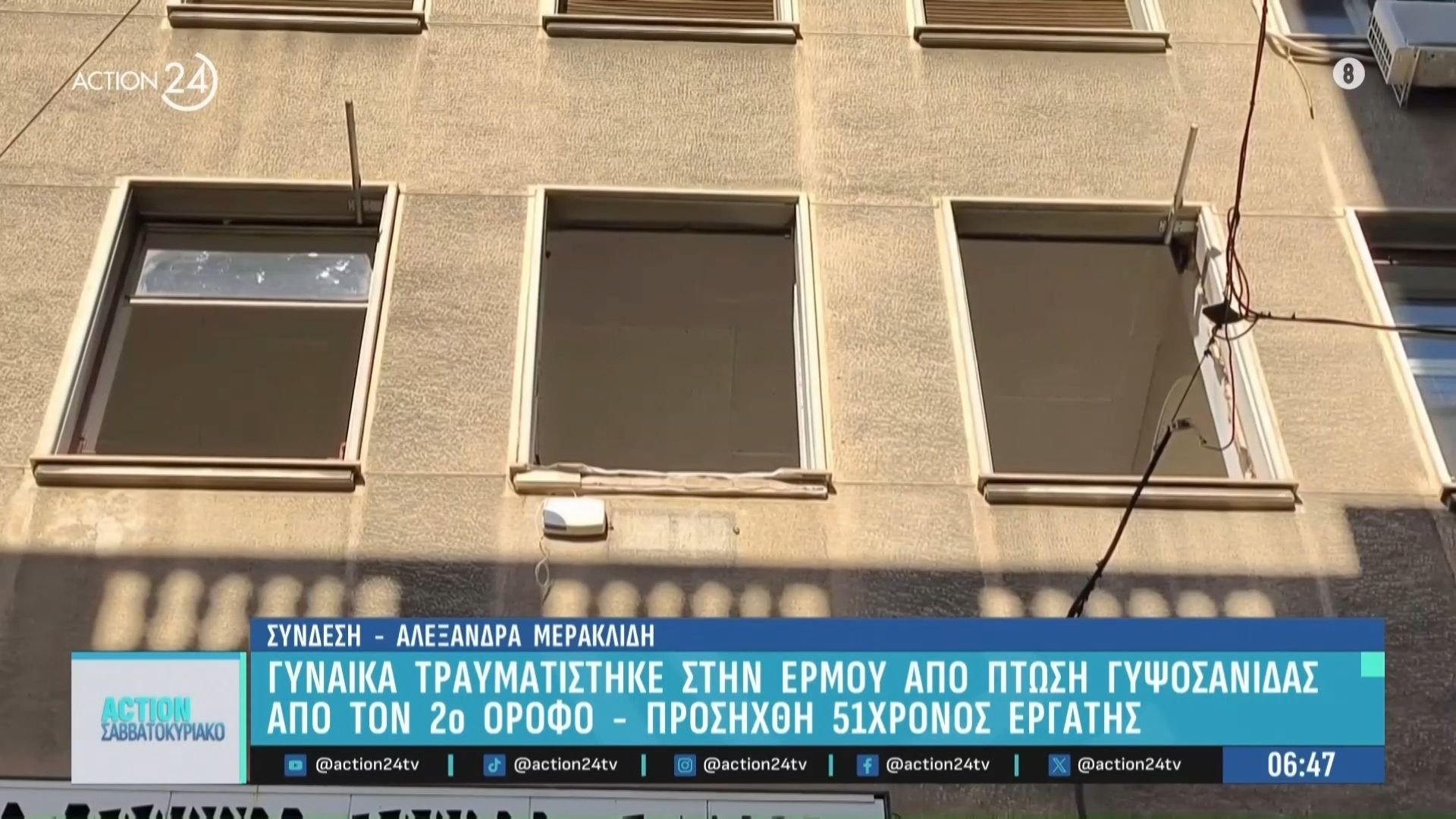 Γυναίκα τραυματίστηκε σοβαρά όταν γυψοσανίδα έπεσε από τον δεύτερο όροφο πολυκατοικίας στην Ερμού. Το περιστατικό συνέβη κατά τη διάρκεια εργασιών ανακαίνισης, με αποτέλεσμα η 40χρονη να μεταφερθεί εσπευσμένα στο νοσοκομείο.