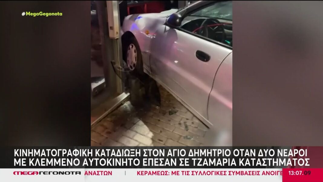 Δύο νεαροί επιχείρησαν να διαφύγουν από τις αρχές οδηγώντας ένα κλεμμένο αυτοκίνητο στον Άγιο Δημήτριο. Η καταδίωξη τους, που είχε έντονο ενδιαφέρον, κατέληξε σε ατύχημα όταν το όχημα έπεσε σε τζαμαρία καταστήματος γεμάτου κόσμο, προκαλώντας πανικό.
