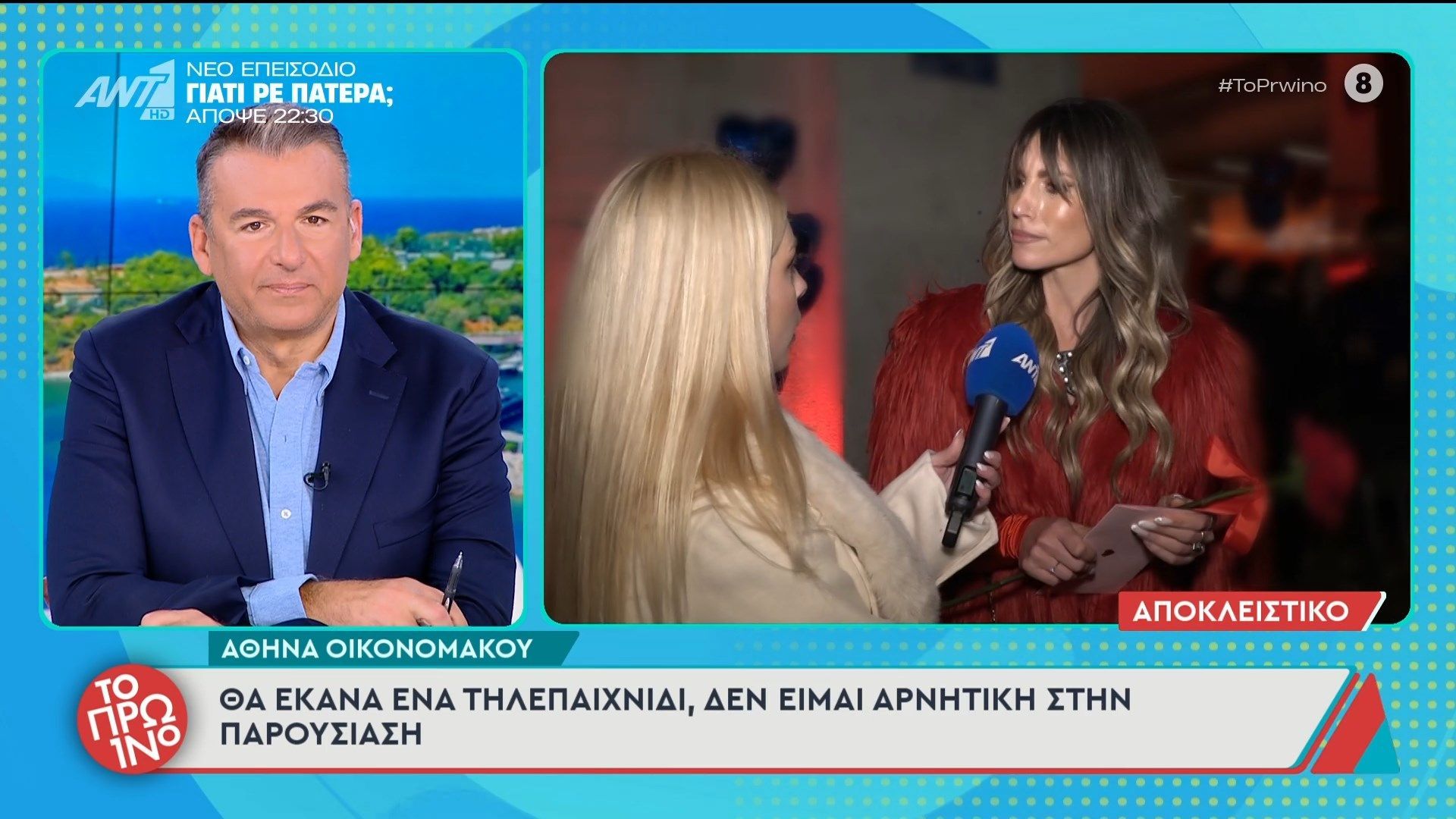 Η Αθηνά Οικονομάκου αποκαλύπτει την επιθυμία της να συμμετάσχει σε τηλεπαιχνίδια, δηλώνοντας ότι δεν είναι αρνητική στην παρουσίαση. Η γνωστή ηθοποιός τονίζει ότι θα εξετάσει σοβαρά την πρόταση αν προκύψει, υπογραμμίζοντας την αγάπη της για την τηλεόραση.