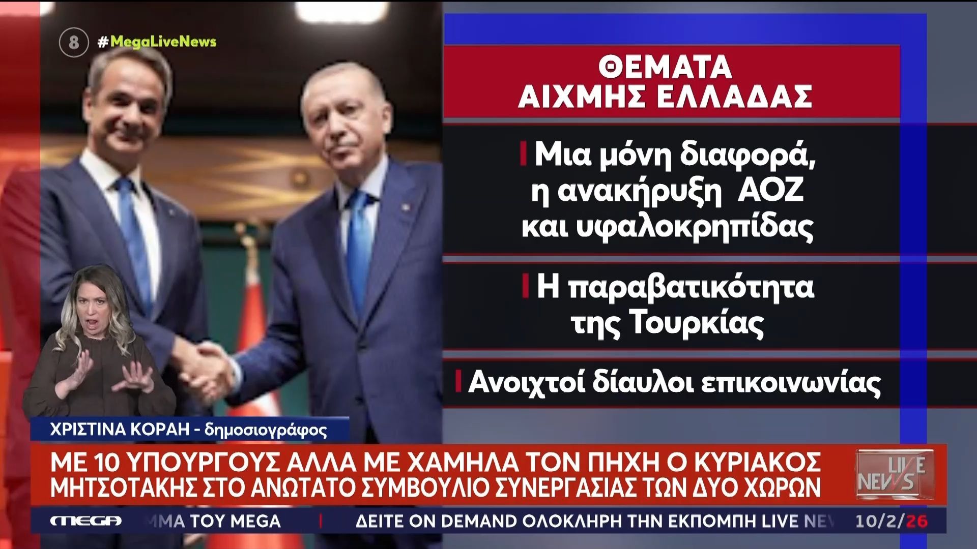 Ο Μητσοτάκης και 10 υπουργοί συναντώνται στην Αθήνα με τούρκους ομολόγους, με χαμηλές προσδοκίες για ουσιαστική πρόοδο, σε κλίμα διμερών εντάσεων.