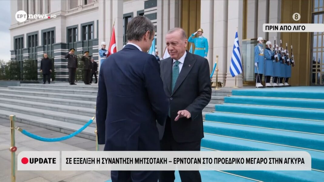 Στο Προεδρικό Μέγαρο στην Άγκυρα, ο Πρόεδρος της Τουρκίας Ρετζέπ Ταγίπ Ερντογάν υποδέχθηκε τον Πρωθυπουργό Κυριάκο Μητσοτάκη. Η συνάντηση πραγματοποιείται στο πλαίσιο των διμερών σχέσεων και των προσπαθειών για την ενίσχυση της συνεργασίας μεταξύ Ελλάδας και Τουρκίας.