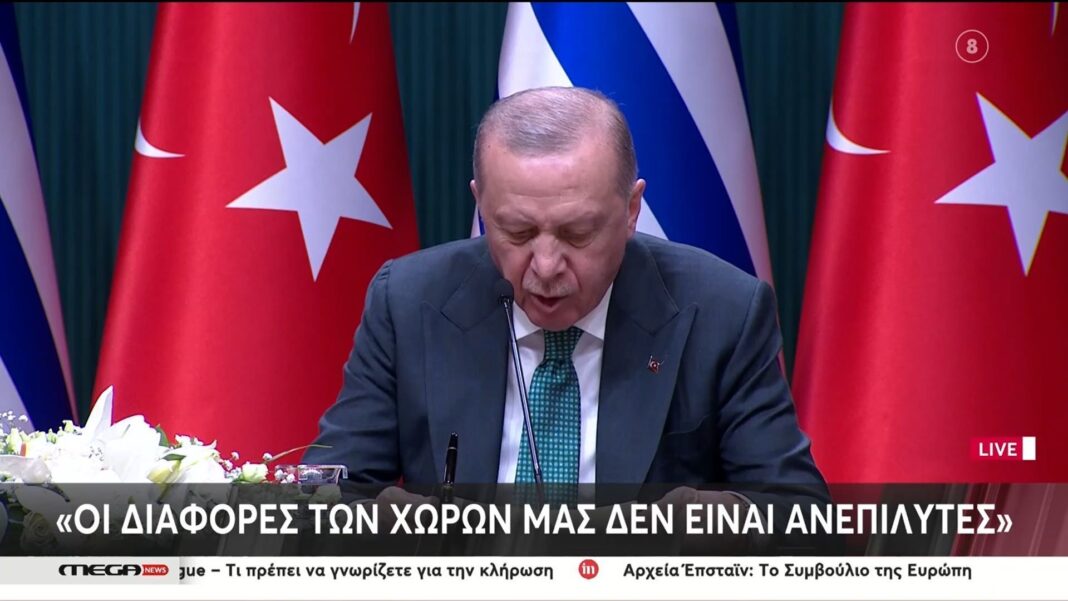 Ο Πρόεδρος της Τουρκίας, Ρετζέπ Ταγίπ Ερντογάν, δήλωσε ότι οι διαφορές μεταξύ Τουρκίας και Ελλάδας δεν είναι ανεπίλυτες, τονίζοντας την σημασία της συνεργασίας για την επίτευξη προόδου. Οι δηλώσεις αυτές έγιναν μετά τη συνάντησή του με τον Έλληνα Πρωθυπουργό, Κυριάκο Μητσοτάκη, όπου υπογράφηκαν σημαντικές συμφωνίες.