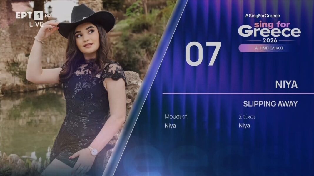Η Niya παρουσιάζει το τραγούδι “Slipping Away” στον Α’ Ημιτελικό για την εκπροσώπηση της Ελλάδας στη Eurovision 2026. Το κομμάτι συνδυάζει μοντέρνους ήχους με ενορχηστρώσεις που αναδεικνύουν τη φωνητική ικανότητα της καλλιτέχνιδας, υποσχόμενος να κλέψει τις εντυπώσεις.