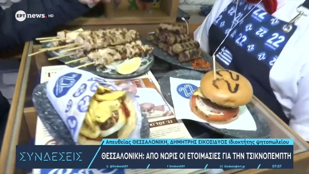 Ο Δημήτρης Εικοσιδυός προετοιμάζει το ψητοπωλείο του στη Θεσσαλονίκη για την Τσικνοπέμπτη, προσφέροντας παραδοσιακές λιχουδιές από νωρίς το πρωί.