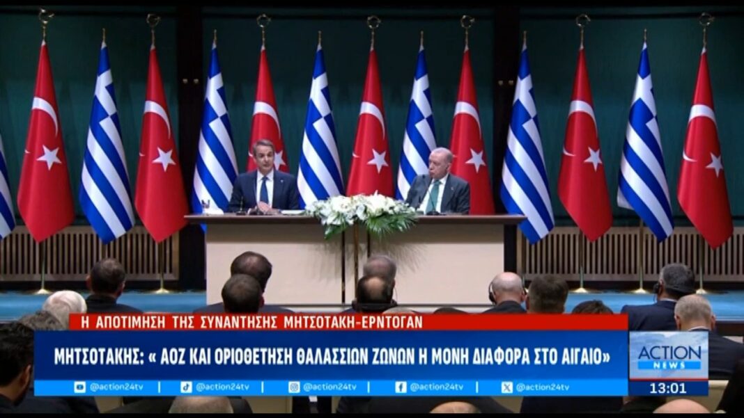 Η συνάντηση μεταξύ του Ρεζέπ Ταγίπ Ερντογάν και του Κυριάκου Μητσοτάκη πραγματοποιήθηκε στην Άγκυρα, με κύριο θέμα συζήτησης το Αιγαίο και το πρόγραμμα SAFE. Οι δύο ηγέτες ανέλυσαν τις τρέχουσες εξελίξεις στην περιοχή και εξέφρασαν την επιθυμία τους για έναν εποικοδομητικό διάλογο.