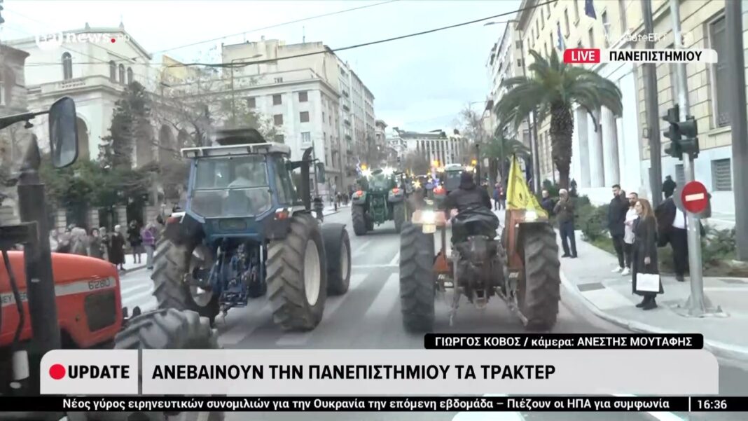 Τρακτέρ έχουν κατακλύσει την οδό Πανεπιστημίου, καθώς αγρότες διαμαρτύρονται για τα προβλήματα που αντιμετωπίζουν στον τομέα τους. Η κινητοποίηση αυτή πραγματοποιείται στο πλαίσιο ευρύτερων απαιτήσεων για καλύτερες συνθήκες εργασίας και στήριξη του αγροτικού τομέα από την πολιτεία.