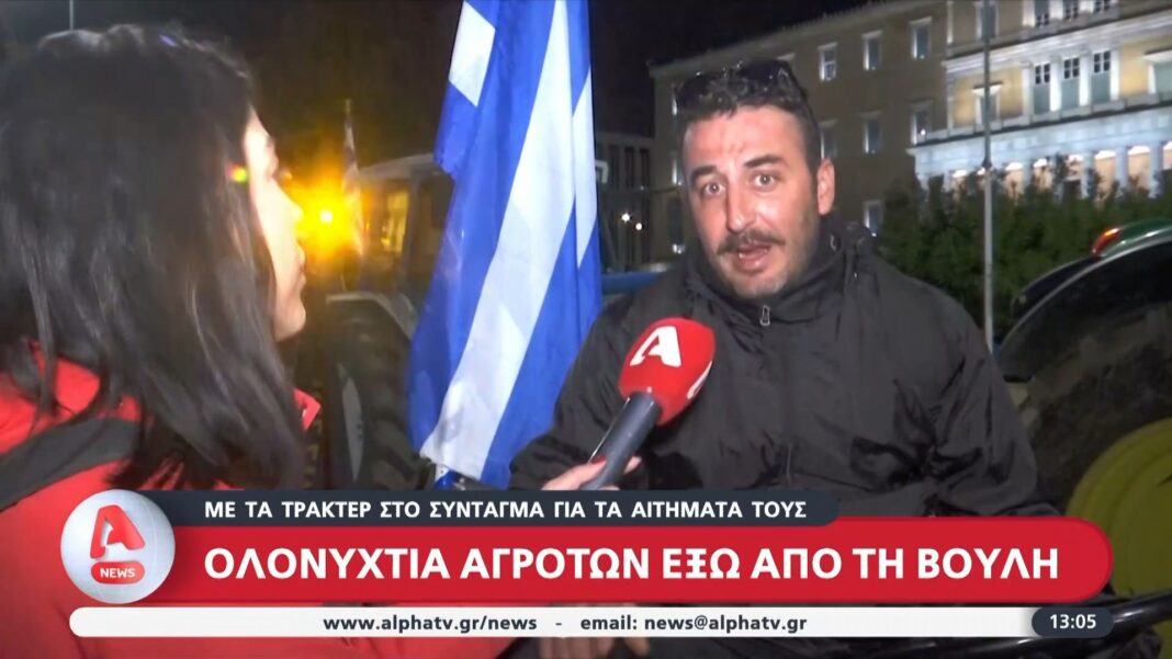 Αγρότες από διάφορες περιοχές της χώρας πραγματοποίησαν ολονύχτια διαμαρτυρία έξω από τη Βουλή, διεκδικώντας καλύτερες συνθήκες εργασίας και στήριξη από την πολιτεία. Οι συμμετέχοντες εξέφρασαν την αγανάκτησή τους για την έλλειψη μέτρων που να ενισχύουν τον αγροτικό τομέα και την επιβίωσή τους.