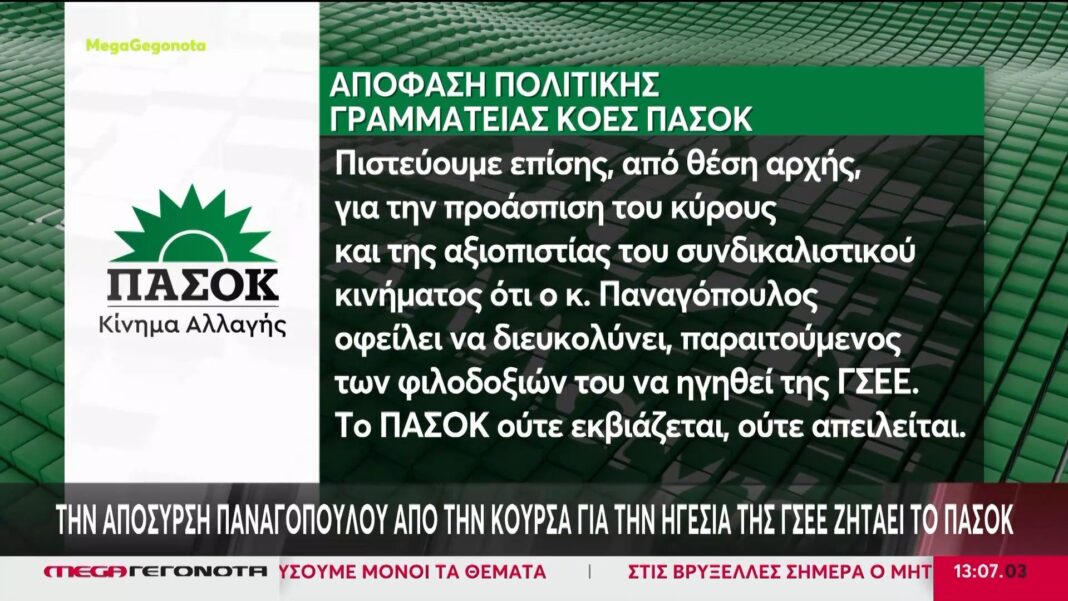 Ραγδαίες εξελίξεις στο ΠΑΣΟΚ εν μέσω της διαμάχης για την ηγεσία της ΓΣΕΕ. Η Πολιτική Γραμματεία του κόμματος ζητά την αποχώρηση του Γιάννη Παναγόπουλου από την υποψηφιότητα, αλλά εκείνος αρνείται να παραιτηθεί, προκαλώντας ένταση.