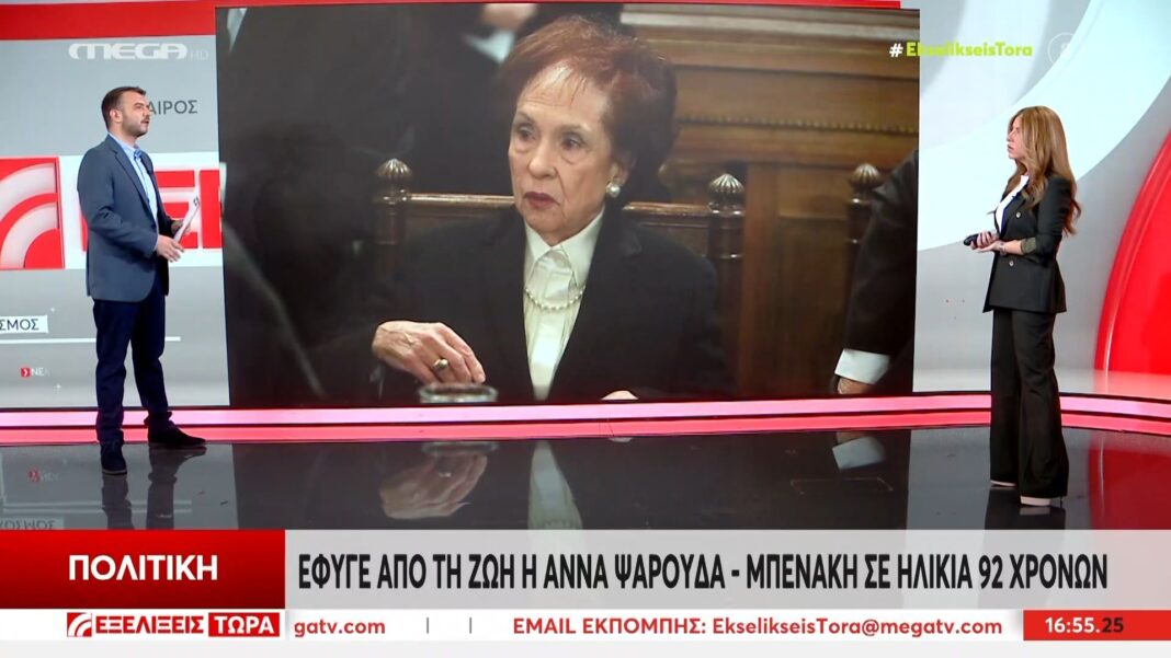 Η Άννα Ψαρούδα Μπενάκη, η πρώτη γυναίκα που υπηρέτησε ως πρόεδρος της Βουλής των Ελλήνων, απεβίωσε σε ηλικία 92 ετών. Η πολιτική της πορεία υπήρξε αξιοσημείωτη, με σημαντική συμβολή στην προώθηση των δικαιωμάτων των γυναικών και στην ενίσχυση της δημοκρατίας στη χώρα.