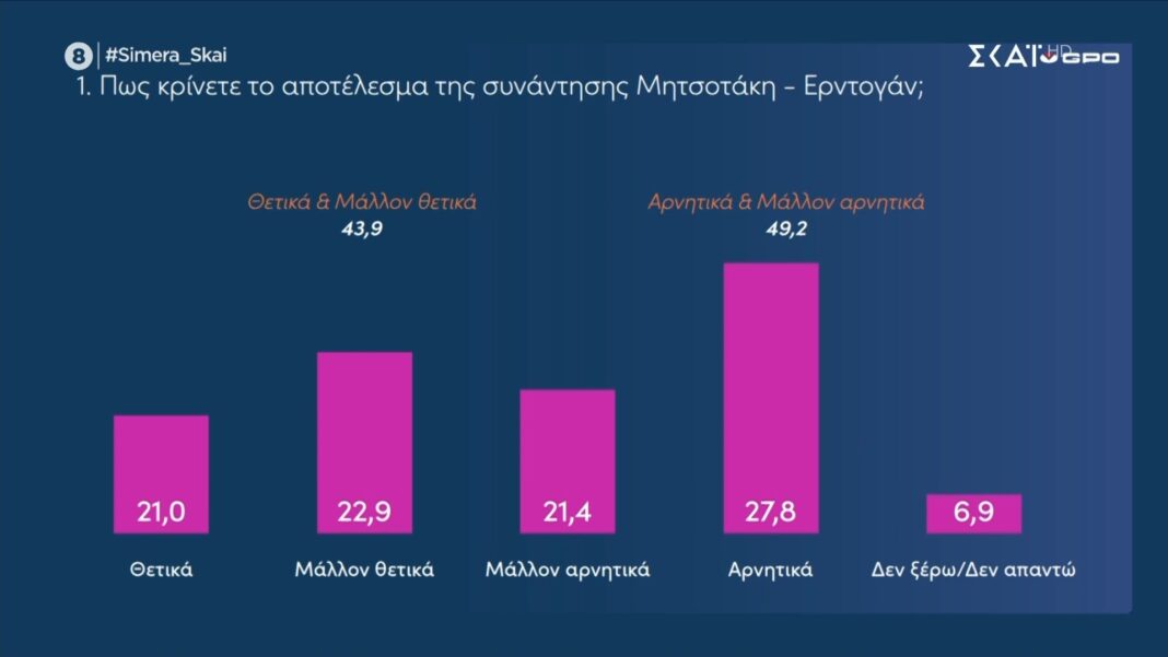 Μια πρόσφατη δημοσκόπηση φέρνει στο φως τις απόψεις των πολιτών σχετικά με τη συνάντηση του Πρωθυπουργού Κυριάκου Μητσοτάκη με τον Τούρκο Πρόεδρο Ρετζέπ Ταγίπ Ερντογάν. Οι πολίτες εκφράζουν ανησυχίες για τις επιπτώσεις που μπορεί να έχει αυτή η συνάντηση στις σχέσεις Ελλάδας-Τουρκίας και στην εθνική ασφάλεια.