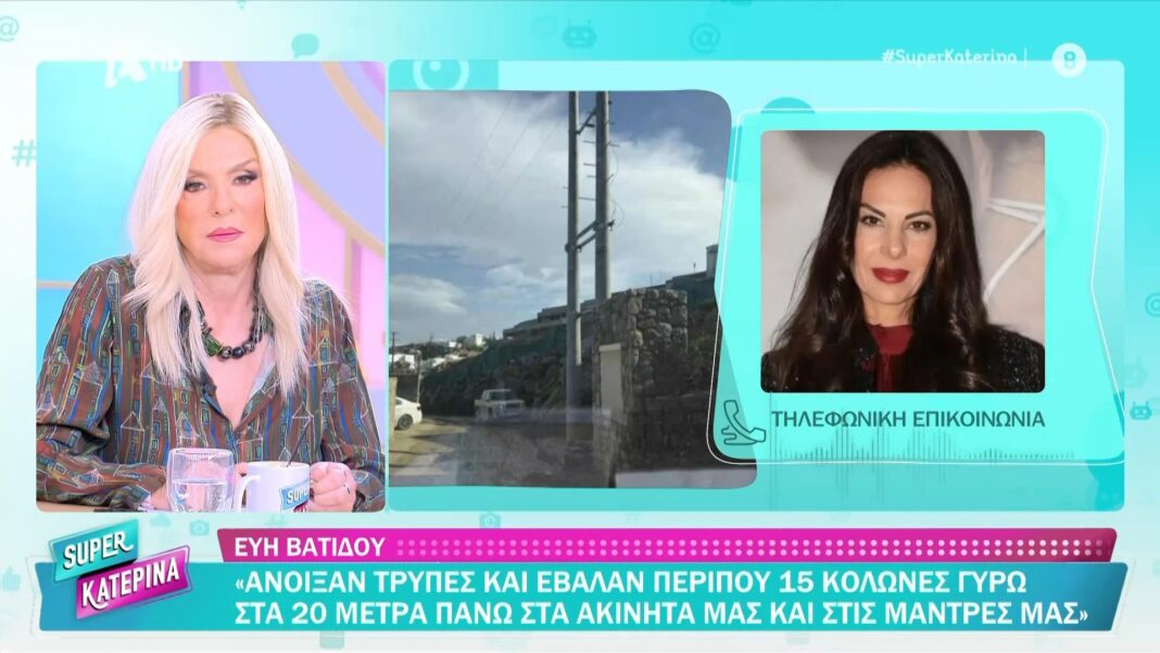 Η Εύη Βατίδου εκφράζει την ανησυχία της για την τοποθέτηση κολόνων του ΔΕΔΔΗΕ σε ιδιωτικό δρόμο κοντά στο σπίτι των παιδιών της στη Μύκονο. Η ίδια ανέφερε ότι δεν έλαβε καμία γραπτή ειδοποίηση από τις αρχές, παρά τις επαφές που είχε μαζί τους.