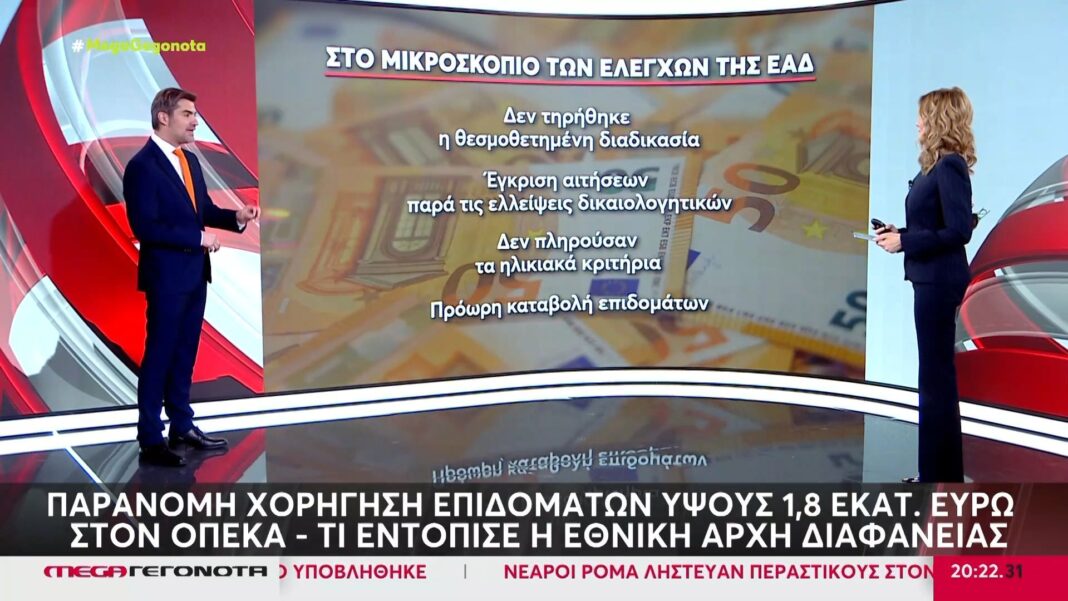 Αποκαλύψεις από την Εθνική Αρχή Διαφάνειας καταδεικνύουν σοβαρές παραλείψεις στη διαδικασία χορήγησης επιδομάτων από τον ΟΠΕΚΑ. Για τουλάχιστον δύο χρόνια, επιδόματα συνολικού ύψους 1,8 εκατ. ευρώ καταβλήθηκαν σε άτομα που δεν πληρούσαν τα κριτήρια, θέτοντας σε κίνδυνο την αξιοπιστία των κρατικών υπηρεσιών.