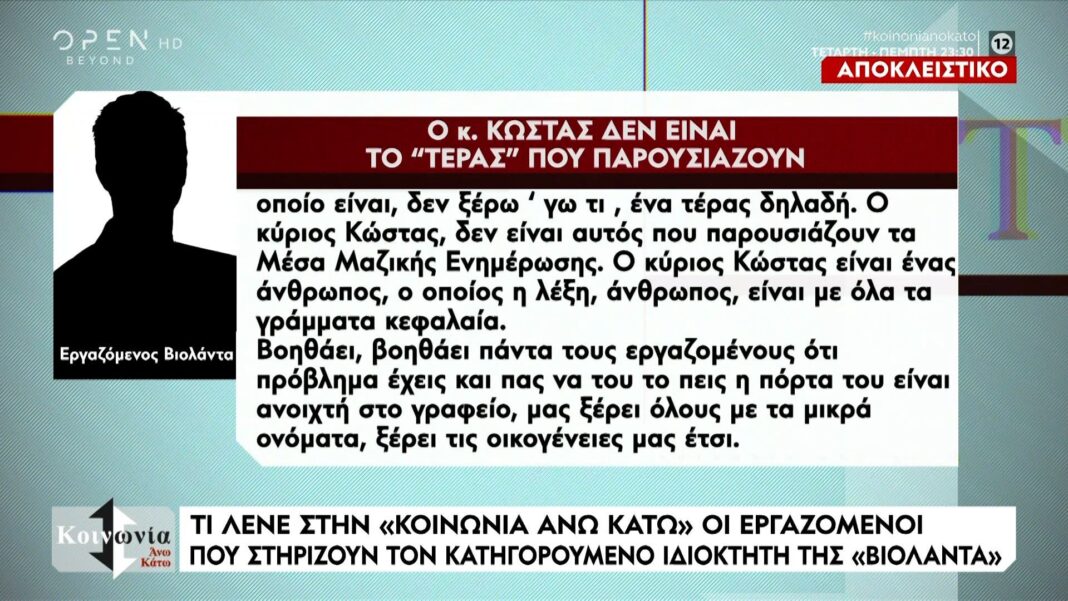 Ένας εργαζόμενος από το εργοστάσιο της «Βιολάντα» μοιράζεται τις σκέψεις του σχετικά με τον ιδιοκτήτη της επιχείρησης, μετά την τραγωδία που οδήγησε στο θάνατο πέντε γυναικών. Σύμφωνα με τον ίδιο, ο ιδιοκτήτης υπήρξε πάντα καλός εργοδότης, επιλύοντας άμεσα οποιοδήποτε πρόβλημα προέκυπτε.