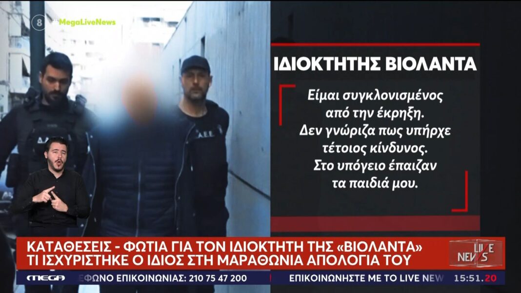 Ο ιδιοκτήτης της «Βιολάντα» κατέθεσε τη μαραθώνια απολογία του στις φυλακές Τρικάλων, όπου αντιμετωπίζει σοβαρές κατηγορίες. Στην απολογία του, ανέφερε ότι οι ενέργειές του ήταν αποτέλεσμα πίεσης και κατηγορηματικά απέρριψε τις κατηγορίες που του αποδίδονται.