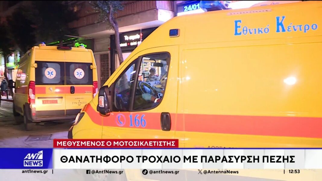 Τα ξημερώματα στο κέντρο της Αθήνας σημειώθηκε ένα θανατηφόρο τροχαίο, με θύμα μια 74χρονη γυναίκα. Ο οδηγός του δίκυκλου, ο οποίος ήταν υπό την επήρεια αλκοόλ, έχασε τον έλεγχο του οχήματος και παρέσυρε τη γυναίκα, προκαλώντας της σοβαρά τραύματα.