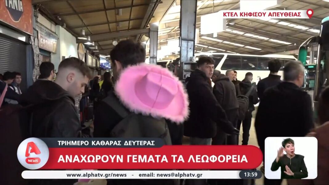 Οι Αθηναίοι αυξάνουν την κίνηση στα αστικά κέντρα καθώς αναχωρούν για τα χωριά τους ενόψει των Απόκρεω και της Καθαράς Δευτέρας. Τα λεωφορεία λειτουργούν με πληρότητα, καθώς πολλές οικογένειες επιλέγουν να περάσουν το τριήμερο σε παραδοσιακά τοπία.
