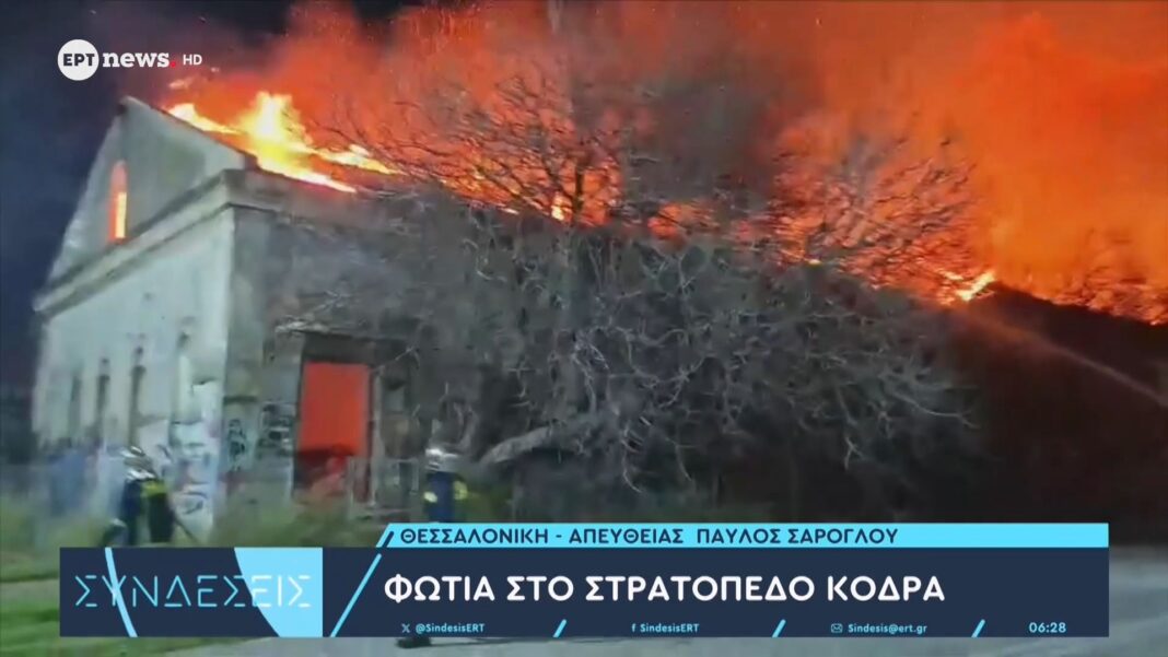 Συναγερμός σήμανε το απόγευμα στο στρατόπεδο Κόδρα, όπου ξέσπασε μεγάλη φωτιά. Οι πυροσβεστικές δυνάμεις κινητοποιήθηκαν άμεσα για την κατάσβεση της, ενώ περιοχές γύρω από το στρατόπεδο εκκενώθηκαν προληπτικά.