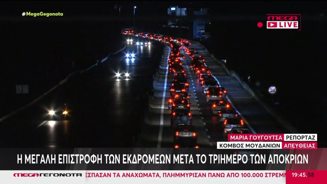 Μετά το τριήμερο των αποκριών, οι δρόμοι είναι γεμάτοι από εκδρομείς που επιστρέφουν στις πόλεις τους. Η κατάσταση είναι δύσκολη, με μεγάλες ουρές και καθυστερήσεις σε πολλές βασικές οδικές αρτηρίες, προκαλώντας ταλαιπωρία για τους οδηγούς.