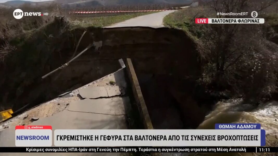 Η γέφυρα στα Βαλτόνερα κατέρρευσε λόγω των συνεχών και έντονων βροχοπτώσεων που πλήττουν την περιοχή. Οι αρχές προχώρησαν σε άμεσες ενέργειες για την αποκατάσταση της κυκλοφορίας και την ασφάλεια των κατοίκων, ενώ οι ζημιές εκτιμώνται σε αρκετές χιλιάδες ευρώ.