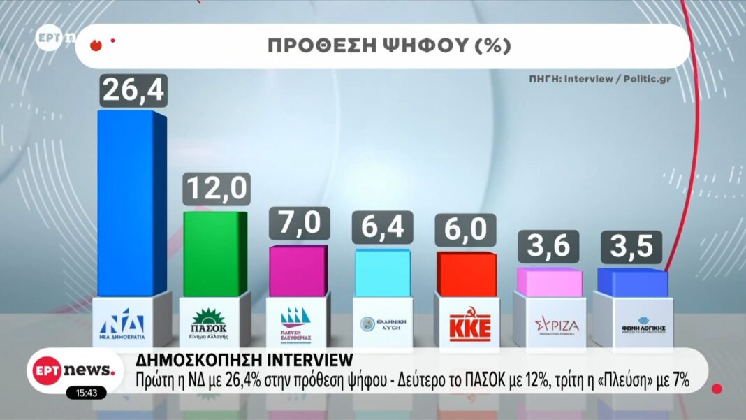 Δημοσκόπηση Interview: Πρώτη η ΝΔ με 26,4% στην πρόθεση ψήφου – Δεύτερο το ΠΑΣΟΚ με 12%, τρίτη η Πλεύση με 7%