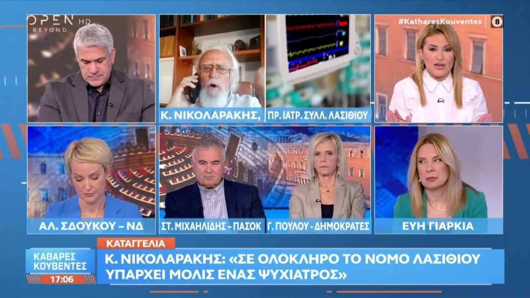 Ο πρόεδρος του ιατρικού συλλόγου Λασιθίου, Κωνσταντίνος Νικολαράκης, καταγγέλλει την εξάντληση που βιώνουν οι γιατροί και οι νοσηλευτές στο νοσοκομείο της περιοχής. Οι εργαζόμενοι βρίσκονται στα όρια της λιποθυμίας, καθώς το νοσοκομείο εφημερεύει καθημερινά για 30 μέρες τον μήνα.