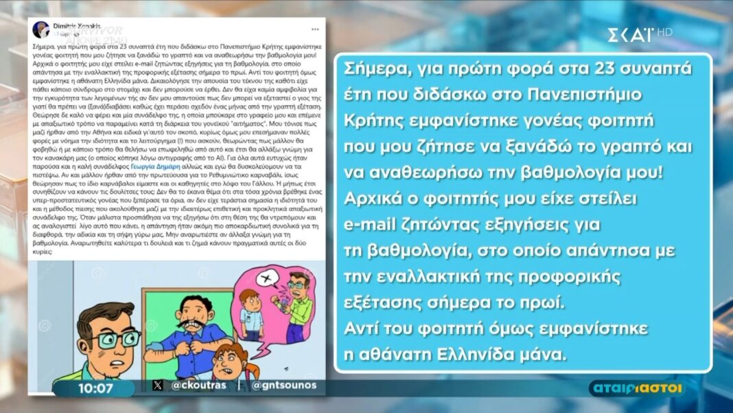 Μητέρα φοιτητή επισκέφθηκε το γραφείο του καθηγητή για να ζητήσει αναβαθμολόγηση του γραπτού του γιου της, το οποίο φέρεται να ήταν αποτέλεσμα αντιγραφής από τεχνητή νοημοσύνη. Η μητέρα υποστηρίζει ότι ο γιος της, παρά την υποβληθείσα εργασία, έχει καταβάλει σημαντική προσπάθεια και αξίζει μια δεύτερη ευκαιρία.