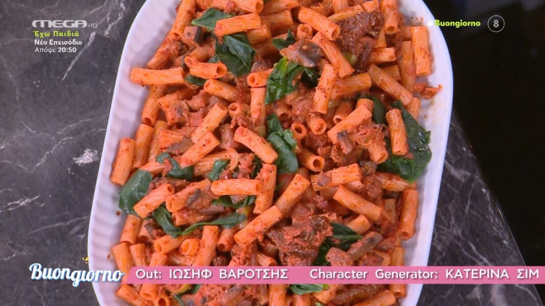 Ο Δημήτρης Σκαρμούτσος μας προτείνει μια νόστιμη συνταγή για ριγκατόνι, που συνδυάζει την πλούσια γεύση της λιαστής ντομάτας με μανιτάρια και σπανάκι. Χρησιμοποιώντας φρέσκα υλικά, όπως πιπεριές Φλωρίνης και πράσινες ελιές, δημιουργεί ένα πιάτο μοναδικά γευστικό και θρεπτικό.