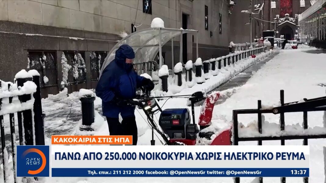 Σφοδρή χιονόπτωση πλήττει τις βορειοανατολικές Ηνωμένες Πολιτείες, με αποτέλεσμα πάνω από 250.000 νοικοκυριά να έχουν μείνει χωρίς ηλεκτρικό ρεύμα. Η Μετεωρολογική Υπηρεσία προειδοποιεί για το χειρότερο κύμα κακοκαιρίας της τελευταίας δεκαετίας, με επικίνδυνες συνθήκες οδήγησης και σοβαρές διακοπές στις μεταφορές.