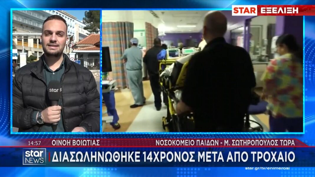 Σε σοβαρή κατάσταση νοσηλεύεται 14χρονος μετά από τροχαίο που σημειώθηκε στην περιοχή της Οινόης Βοιωτίας. Το παιδί διασωληνώθηκε και οι γιατροί καταβάλλουν συνεχείς προσπάθειες για τη σταθεροποίηση της υγείας του.