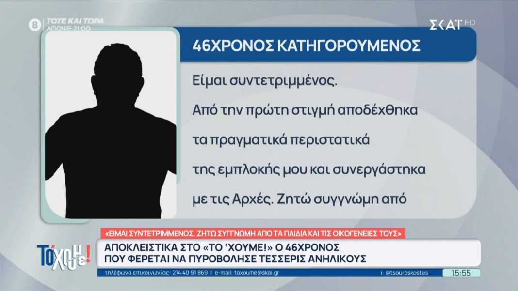 Στο Αίγιο, 46χρονος άνδρας που κατηγορείται για πυροβολισμούς σε τέσσερις ανήλικους, παραχώρησε αποκλειστικές δηλώσεις. Ο δράστης ισχυρίστηκε ότι δεν είχε πρόθεση να προκαλέσει θάνατο και εξέφρασε τη λύπη του για το περιστατικό.