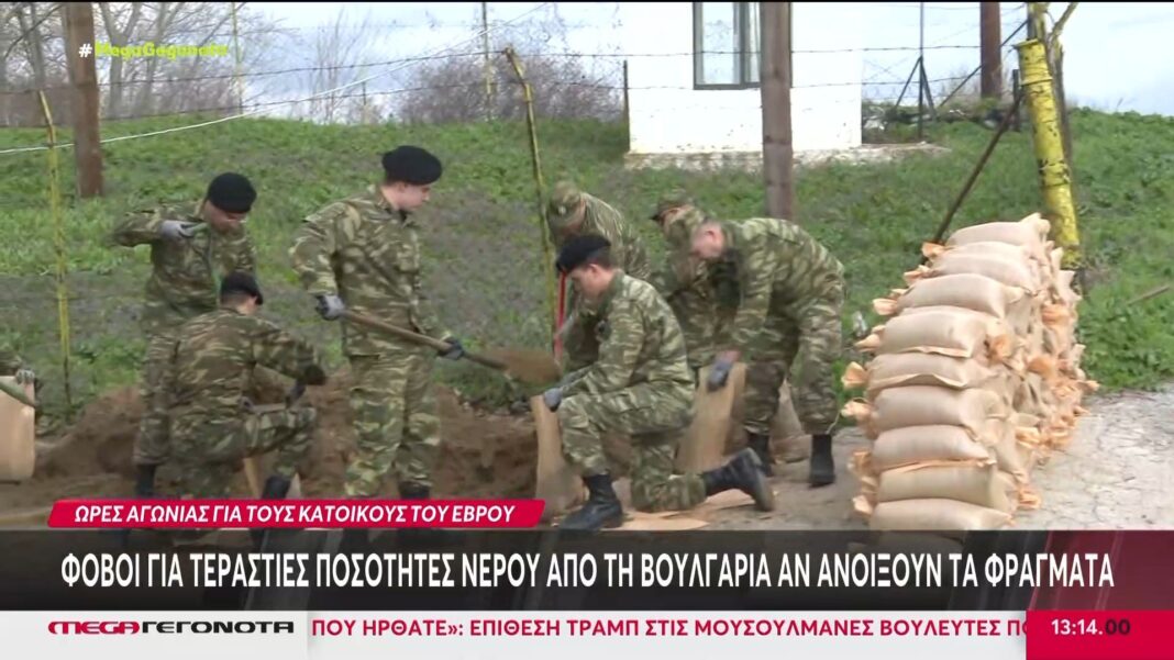 Σακιά με άμμο τοποθετούν οι στρατιώτες στον Έβρο, σε μια προσπάθεια να προληφθούν οι πιθανές πλημμύρες εξαιτίας των αναμενόμενων έντονων βροχοπτώσεων. Οι αρχές ανησυχούν για τις επιπτώσεις που μπορεί να έχει η αύξηση της στάθμης του νερού στην περιοχή, καθώς οι προηγούμενες καταστροφές είναι ακόμα νωπές στη μνήμη των κατοίκων.
