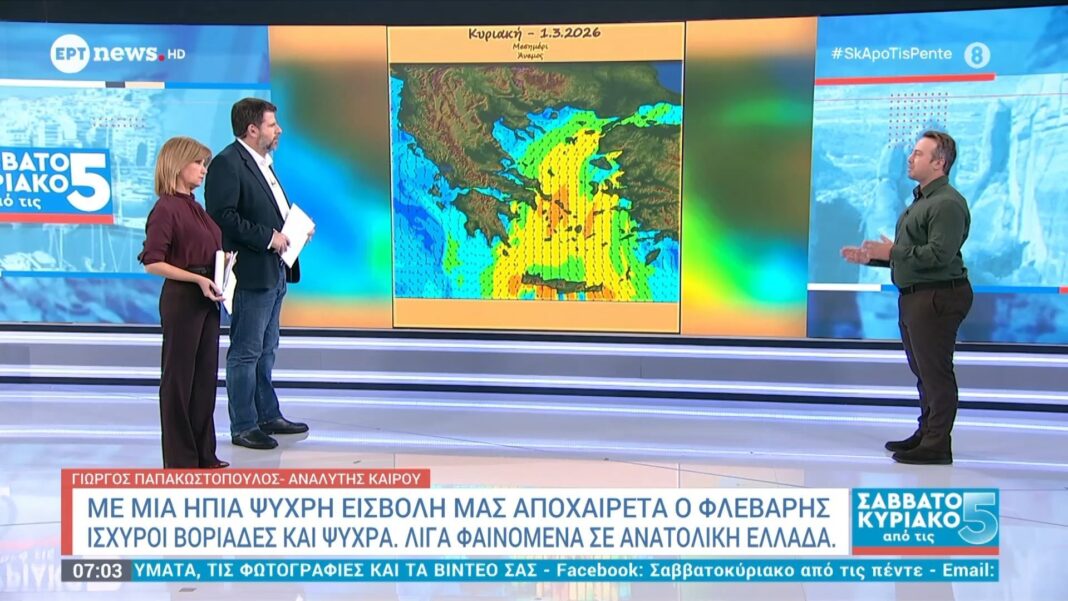 Ο Φλεβάρης αποχαιρετά με μια ψυχρή εισβολή, φέρνοντας χαμηλές θερμοκρασίες και πιθανές χιονοπτώσεις σε πολλές περιοχές της χώρας. Ο Γιώργος Παπακωστόπουλος, αναλυτής καιρού, αναλύει την επικείμενη κακοκαιρία και τα φαινόμενα που θα επηρεάσουν την καθημερινότητα των πολιτών.