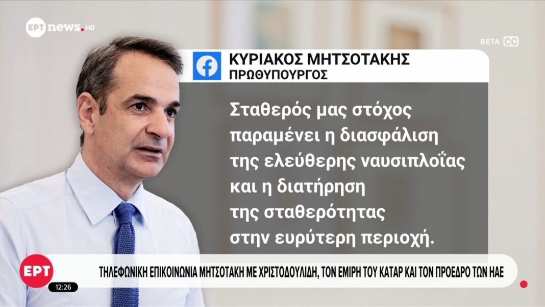 Ο Κυριάκος Μητσοτάκης είχε σήμερα τηλεφωνικές συνομιλίες με τον Νίκο Χριστοδουλίδη, τον Εμίρη του Κατάρ και τον Πρόεδρο των Ηνωμένων Αραβικών Εμιράτων. Οι συζητήσεις επικεντρώθηκαν στις τρέχουσες εξελίξεις στη Μέση Ανατολή και τη σημασία της σταθερότητας στην περιοχή.