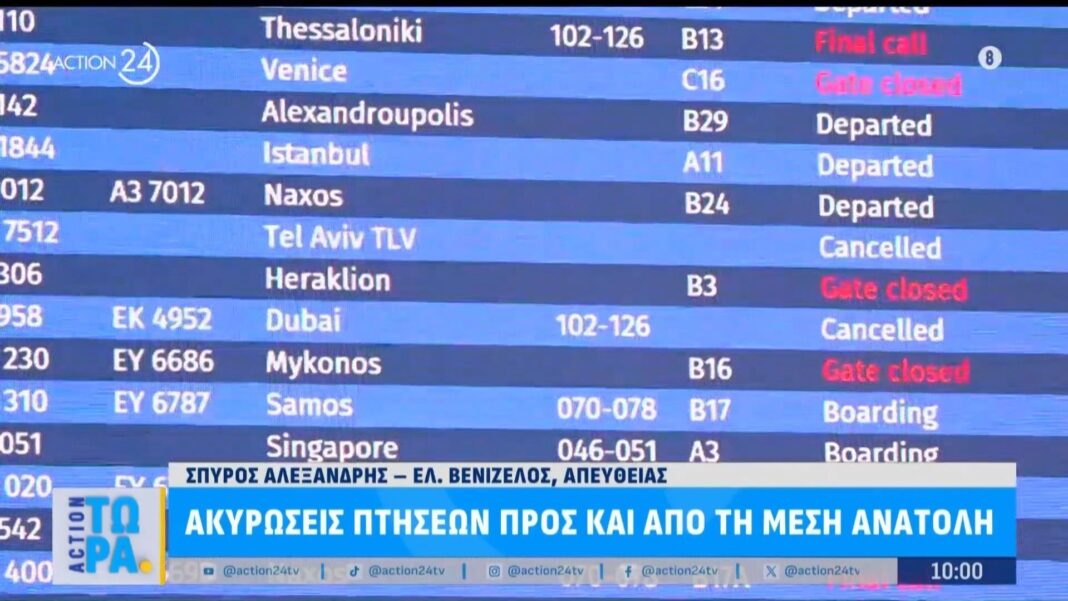 Ακυρώσεις πτήσεων έχουν σημειωθεί προς και από τη Μέση Ανατολή, προκαλώντας αναστάτωση στους ταξιδιώτες. Οι αεροπορικές εταιρείες ενημερώνουν τους επιβάτες για τις αλλαγές στα δρομολόγια, καθώς οι συνθήκες ασφαλείας επηρεάζονται από τις τελευταίες εξελίξεις στην περιοχή.