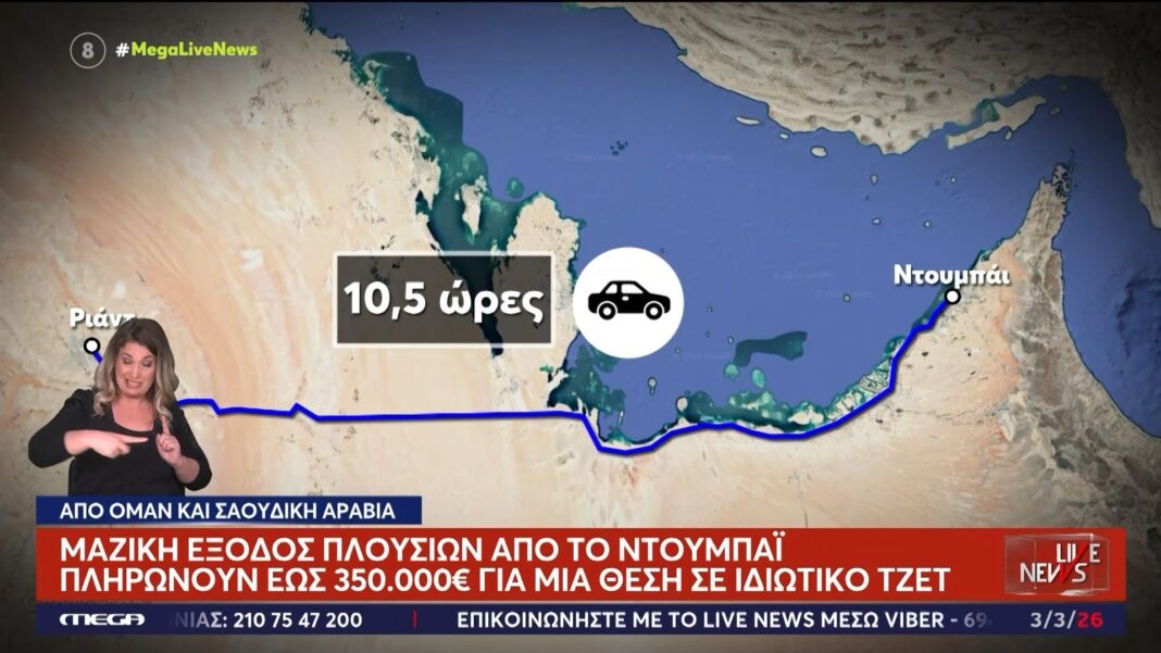 Μια μαζική έξοδος πλουσίων παρατηρείται από το Ντουμπάι προς το Ομάν και τη Σαουδική Αραβία, καθώς πολλοί επιλέγουν να εγκαταλείψουν τις Ηνωμένες Αραβικές Εμιράτες. Ορισμένοι από αυτούς πληρώνουν μέχρι και 350.000 ευρώ για μια θέση σε ιδιωτικό τζετ, γεγονός που καταδεικνύει την επείγουσα φύση της απομάκρυνσής τους.