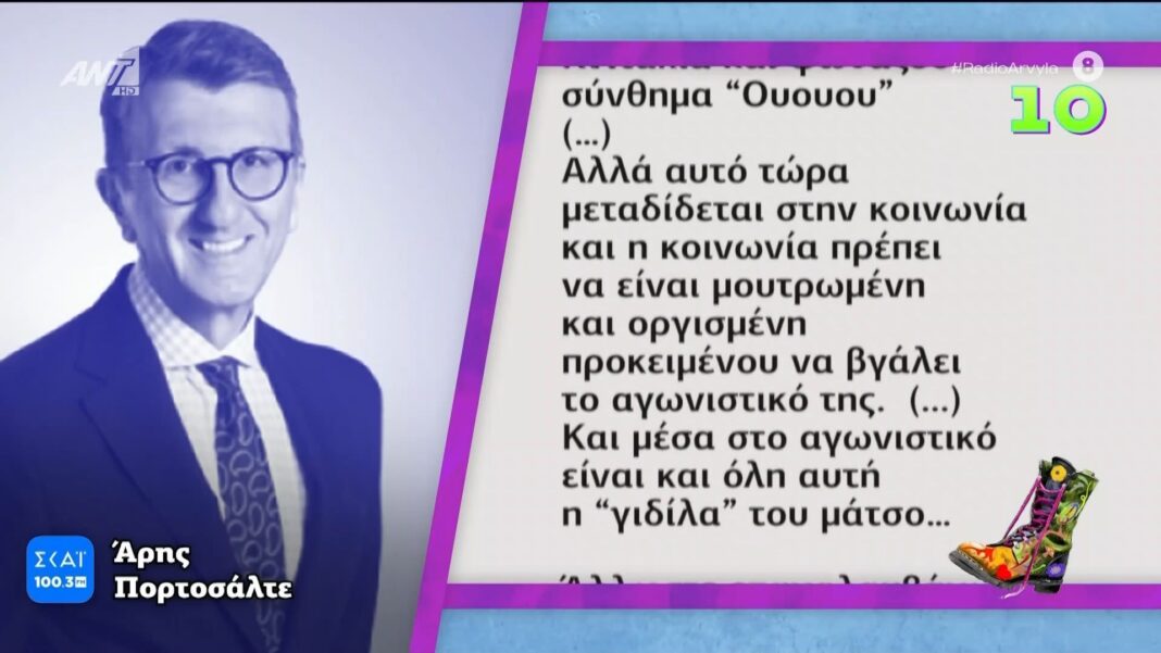 Ο Αντώνης Κανάκης εκφράζει τη δυσαρέσκειά του για τις δηλώσεις του Άρη Πορτοσάλτε, τονίζοντας ότι οι τελευταίες του τοποθετήσεις δεν αντανακλούν μια σοβαρή ανάλυση της πραγματικότητας. Κατά την άποψή του, οι αιτιάσεις του Πορτοσάλτε προέρχονται από προσωπικά βιώματα και απογοήτευση, καθώς φαίνεται να επηρεάζονται από την καθημερινότητά του στο γραφείο.