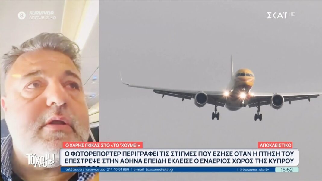 Ο Χάρης Γκίκας, επιβάτης πτήσης από την Αθήνα προς την Κύπρο, περιγράφει τις αγωνιώδεις στιγμές που βίωσε όταν το αεροπλάνο δεν μπόρεσε να προσγειωθεί στον προορισμό του. Η πτήση αναγκάστηκε να αλλάξει δρομολόγιο λόγω του κλειστού εναέριου χώρου στην Κύπρο, γεγονός που προκάλεσε ανησυχία στους επιβάτες.