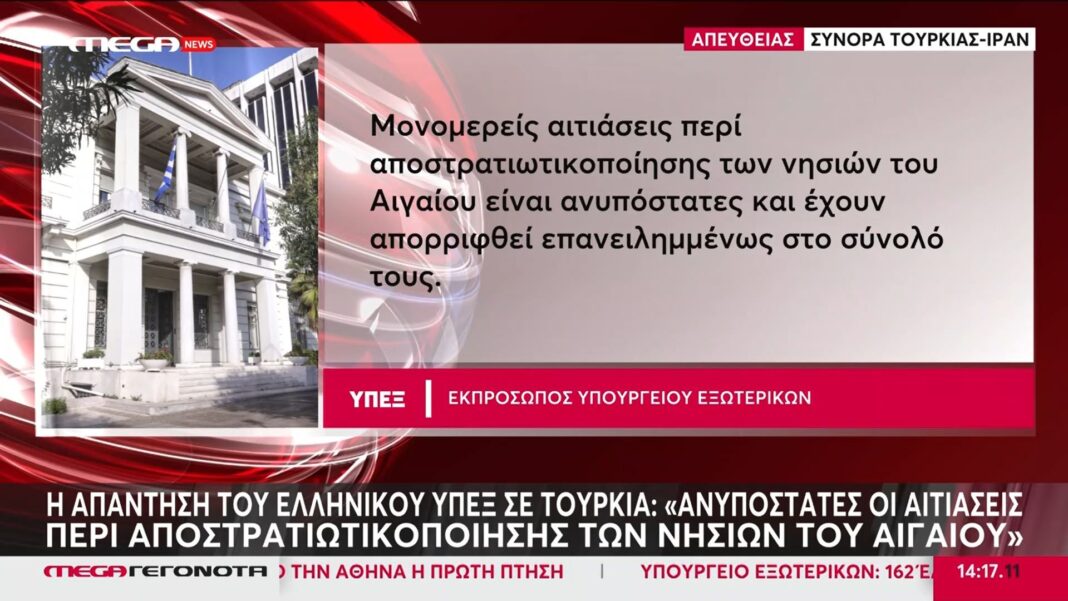 Η απάντηση του ελληνικού ΥΠΕΞ στην Τουρκία σχετικά με την αποστρατικοποίηση των νησιών του Αιγαίου