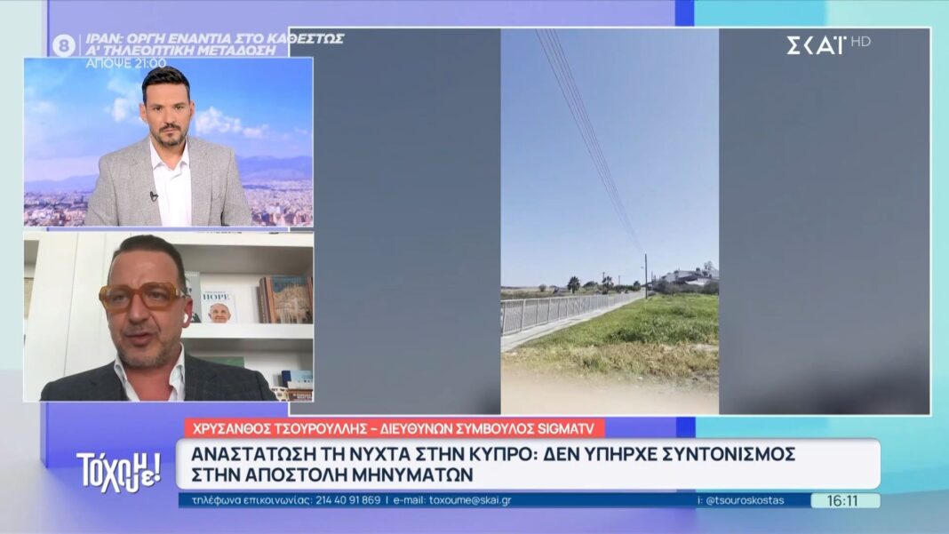 Η κατάσταση στην Κύπρο έχει επιδεινωθεί τις τελευταίες ώρες, καθώς το Υπουργείο Εσωτερικών καταγράφει τις αστοχίες που προέκυψαν κατά την αποστολή μηνυμάτων ενημέρωσης στους πολίτες. Ο διευθύνων σύμβουλος του Sigma TV, Χρύσανθος Τσουρούλλης, αναφέρεται στα προβλήματα που προέκυψαν και στις αντιδράσεις του κοινού.