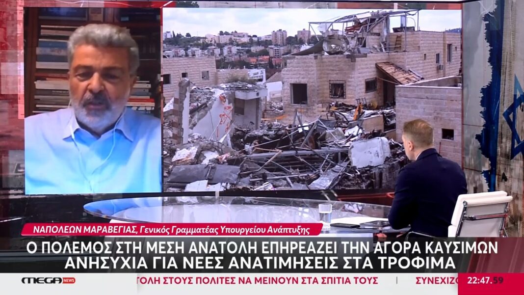 Ο Ναπολέων Μαραβέγιας, Γενικός Γραμματέας Υπουργείου Ανάπτυξης, αναλύει τις τρέχουσες εξελίξεις στη Μέση Ανατολή και τον αντίκτυπό τους στην ελληνική οικονομία. Επικεντρώνεται στα προβλήματα που αντιμετωπίζει η αγορά καυσίμων λόγω της διεθνούς αναστάτωσης.