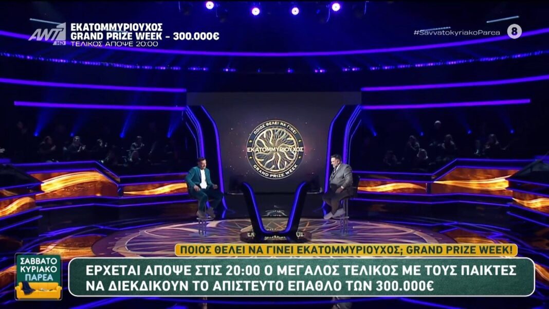 Κυριακή στις 20:00, οι τηλεθεατές θα παρακολουθήσουν τον μεγάλο τελικό, όπου οι συμμετέχοντες θα διεκδικήσουν ένα εντυπωσιακό έπαθλο ύψους 300.000 ευρώ. Το ενδιαφέρον κορυφώνεται, καθώς οι παίκτες θα απαντήσουν σε δύσκολες ερωτήσεις και θα προσπαθήσουν να αποδείξουν τις γνώσεις τους.
