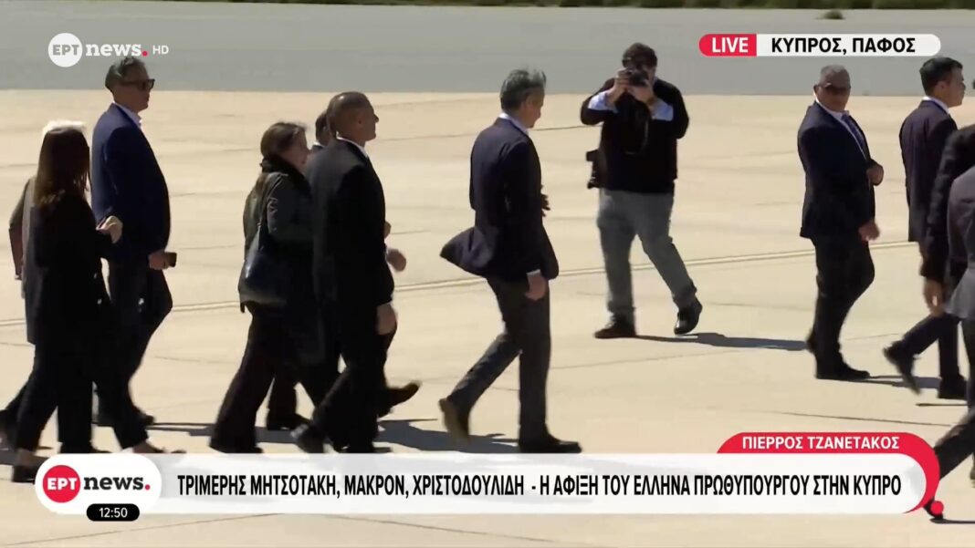 Στο στρατιωτικό αεροδρόμιο της Πάφου έφτασε ο Έλληνας πρωθυπουργός, Κυριάκος Μητσοτάκης, το μεσημέρι της Δευτέρας, 9 Μαρτίου. Τον υποδέχθηκε ο Πρόεδρος της Κυπριακής Δημοκρατίας, Νίκος Χριστοδουλίδης, συνοδευόμενος από τον υπουργό Άμυνας.