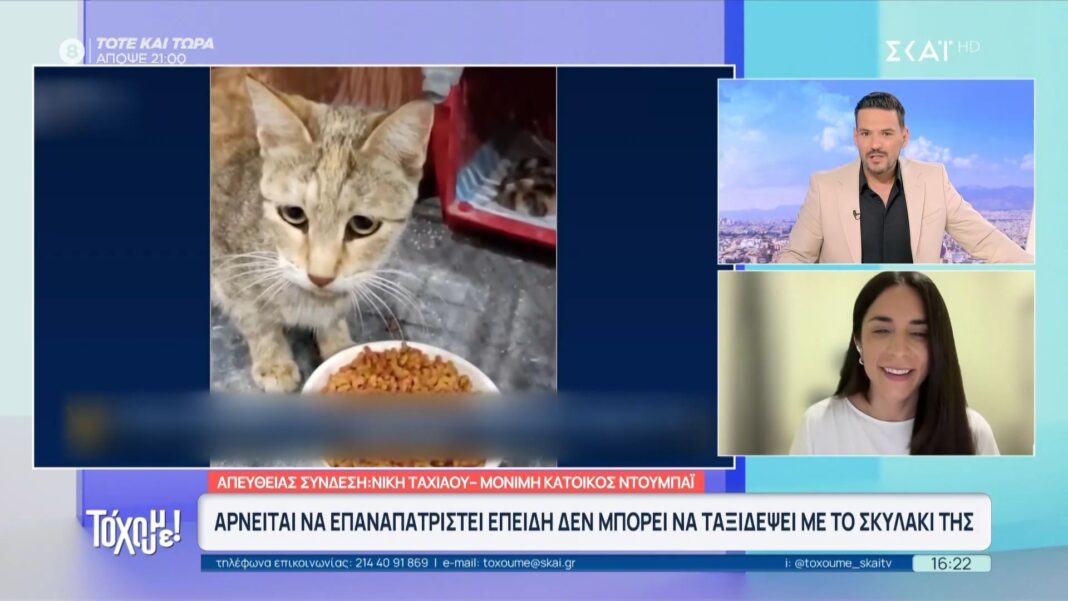 Η Νίκη Ταχιάου, Ελληνίδα κάτοικος Ντουμπάι, αντιμετωπίζει σοβαρό πρόβλημα με την επιστροφή της στην πατρίδα λόγω του σκύλου της. Η διαδικασία για τη μεταφορά κατοικίδιων ζώων στην Ελλάδα είναι περίπλοκη και απαιτεί προετοιμασία, γεγονός που την αναγκάζει να παραμείνει στο Ντουμπάι.