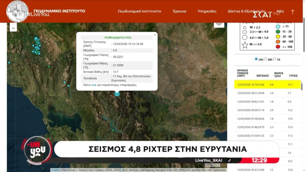 Σεισμική δόνηση 4,8 ρίχτερ καταγράφηκε στην Ευρυτανία, προκαλώντας ανησυχία στους κατοίκους της περιοχής. Ο σεισμός έγινε αισθητός σε πολλές γειτονικές περιοχές, χωρίς μέχρι στιγμής να αναφέρονται σοβαρές ζημιές ή θύματα.