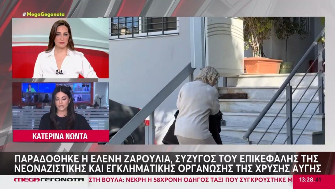 Η Ελένη Ζαρούλια, σύζυγος του αρχηγού της Χρυσής Αυγής, Νίκου Μιχαλολιάκου, παραδόθηκε στο Αστυνομικό Τμήμα Πεύκης. Η παρουσία της συνοδευόταν από την κόρη της, με τις αρχές να διαχειρίζονται την κατάσταση με προσοχή.