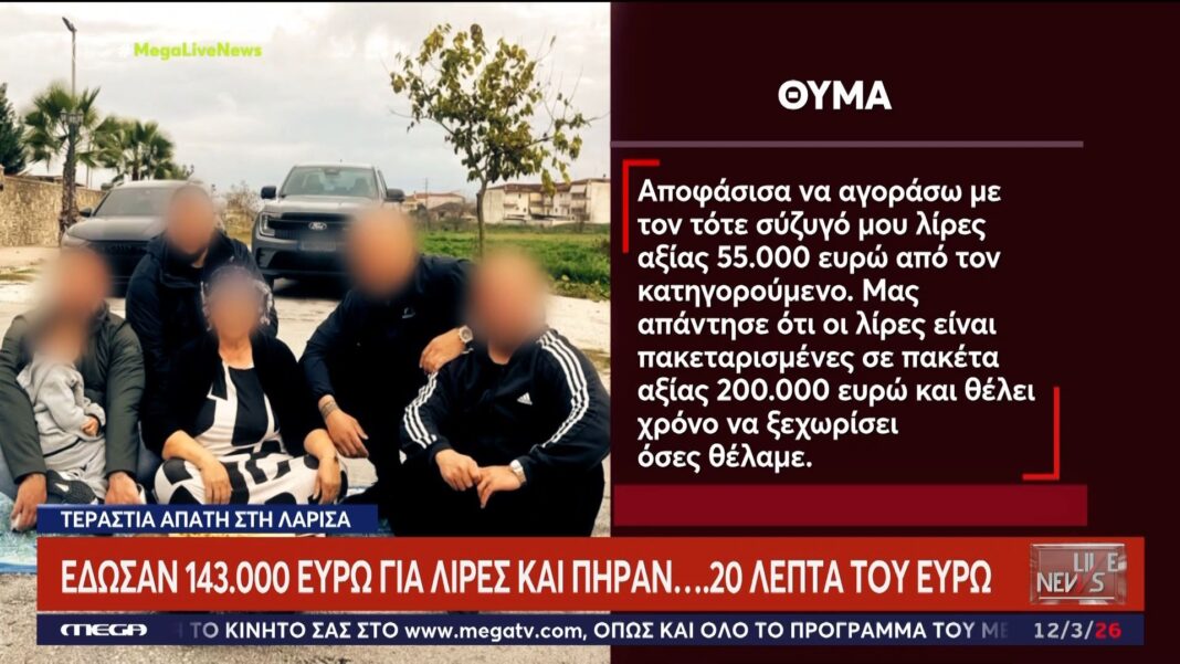 Στη Λάρισα, μια σοκαριστική απάτη έχει αποκαλυφθεί, με θύματα ανθρώπους που επένδυσαν 143.000 ευρώ σε δήθεν χρυσές λίρες. Αντί για τα πολυπόθητα νομίσματα, έλαβαν μόλις 20 λεπτά του ευρώ, αφήνοντας τους ανυποψίαστους επενδυτές σε πλήρη απόγνωση.