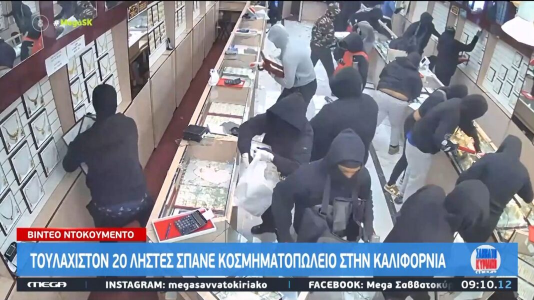 Τουλάχιστον 20 άτομα επιτέθηκαν σε κοσμηματοπωλείο στην Καλιφόρνια, προκαλώντας σοβαρές ζημιές και κλοπή πολύτιμων κοσμημάτων. Η αστυνομία έφτασε γρήγορα στη σκηνή, αλλά οι δράστες κατάφεραν να διαφύγουν πριν από την άφιξή τους.