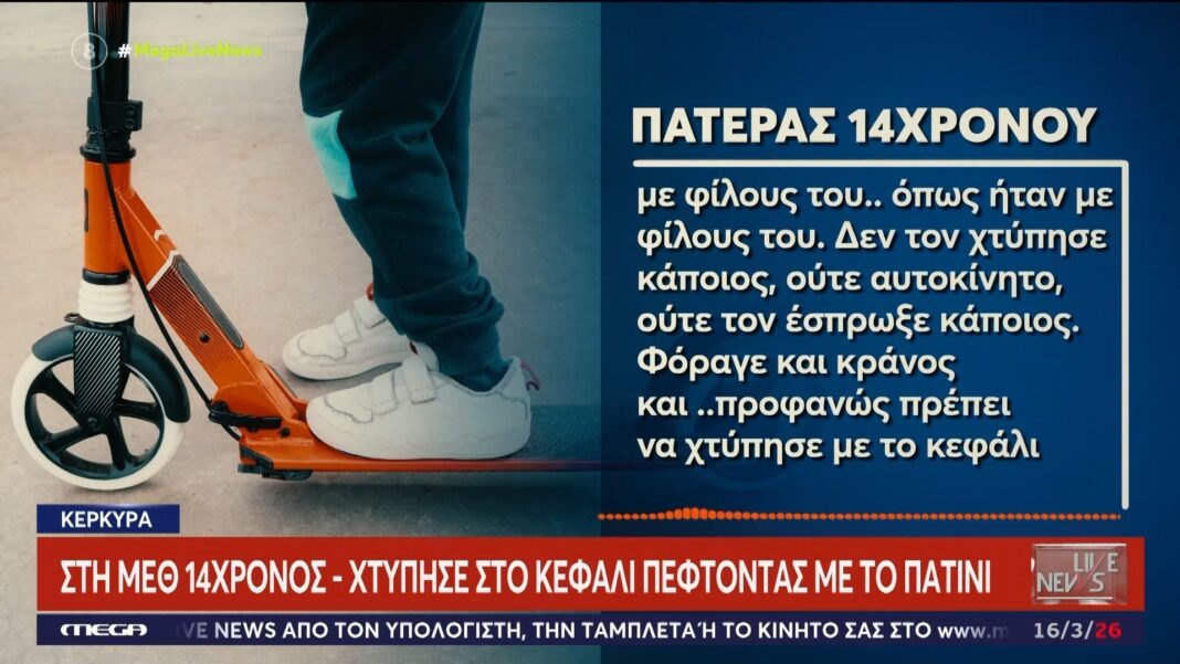 14χρονος νοσηλεύεται στη ΜΕΘ μετά από σοβαρό ατύχημα με το πατίνι του, κατά το οποίο υπέστη πλήγμα στο κεφάλι. Οι γιατροί προχώρησαν σε δύο χειρουργικές επεμβάσεις για την αποκατάσταση της κατάστασής του, με την υγεία του να είναι πλέον σταθερή.